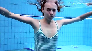 Huge-chested and beautiful new redhead babe in the pool undresses underwater