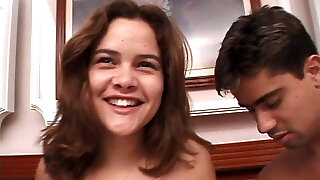 Slim brunette caught a young stud sucking his stepdad's cock and then she joined them for a great bisexual three-way