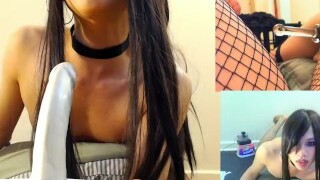 Japanese Goth Crossdresser spit roasts herself and gags